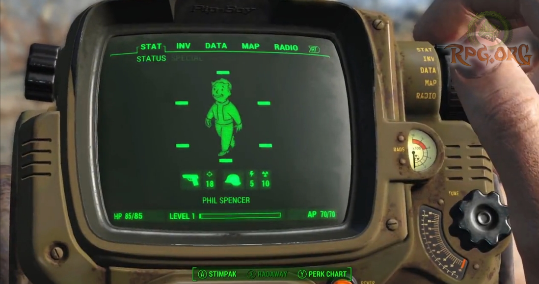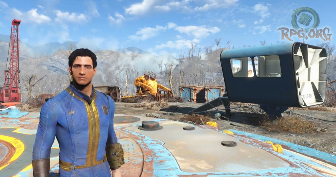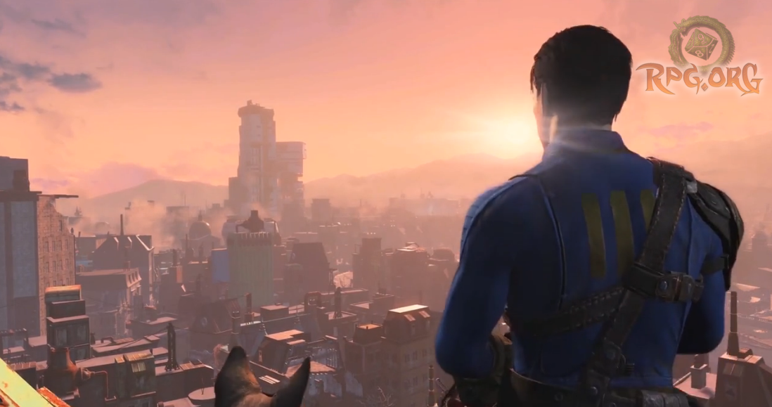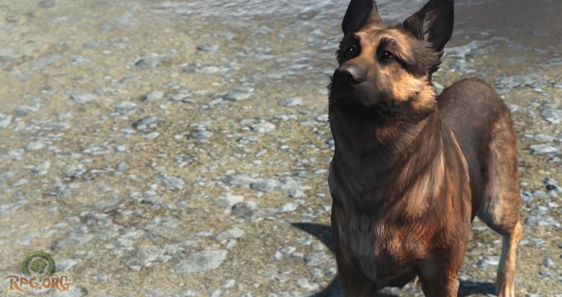 The video starts off with you emerging into the sunlight, scanning the scenery and then circling around your character. Of course, we get our first glimpse at the new pip boy as he scrolls through it and a dynamic view of him checking it out. Some lapsing of walking, and a billboard, and more scenery, so on and so forth. I do have to say, the imagery is breath taking. Finally you get into town with an astonished Chatsworth offering to make you a snack. To which the character somewhat reluctantly agrees. After that you follow up to see this handsome devil as you begin to approach from a distance, your canine companion.