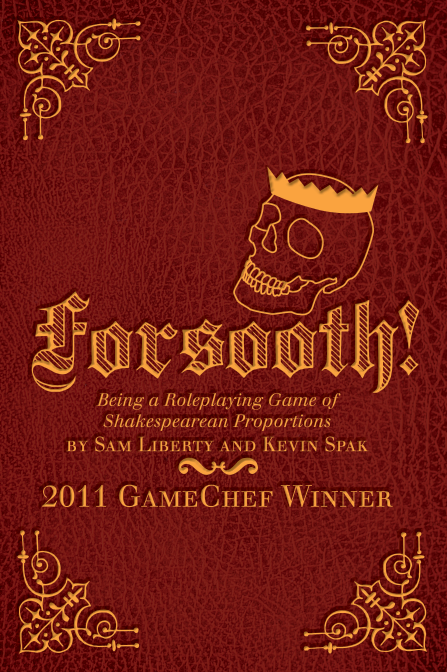 BOSTON, Mass., May 31, 2012 -- Hear ye, hear ye! Spoiled Flush Games today announced their first self-published game: Forsooth!, an RPG of Shakespearean proportions. A greatly expanded update of the Game Chef 2011-winning game of the same name, Forsooth! challenges players to improvise one of the bard’s greatest lost work for the amusement of their friends. It will be available in paperback, pdf, and ebook on June 22.